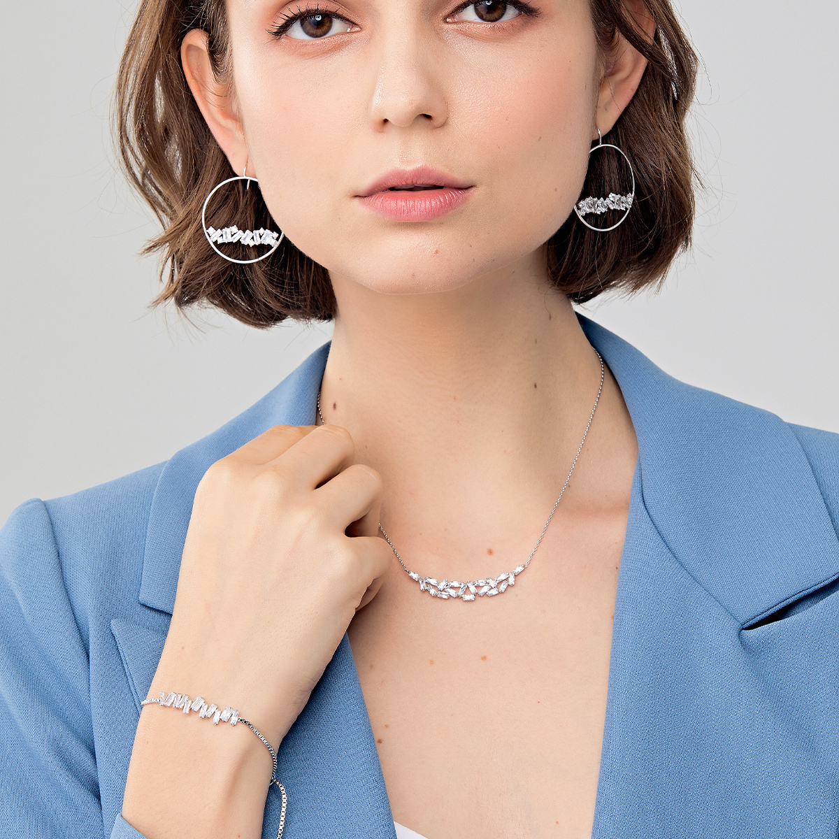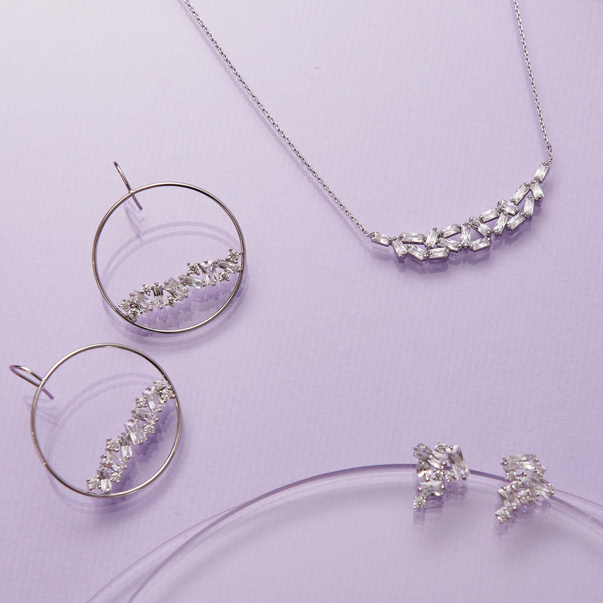 市場上的Baguette cut 通常是以一顆長方形切割的設計為重點。 Nuri 設計師喜愛各種材質的混搭設計。 也喜好將同一切割的鋯石用不同的排序及疊搭。