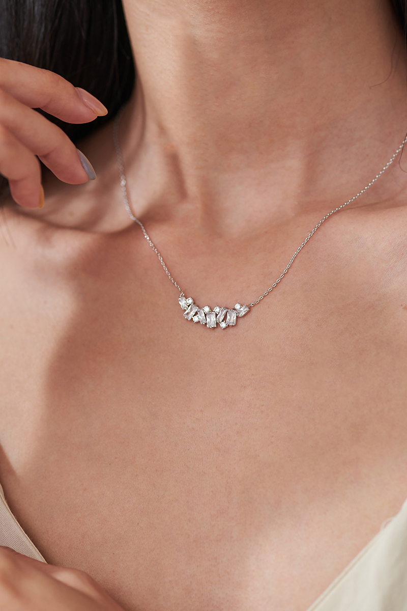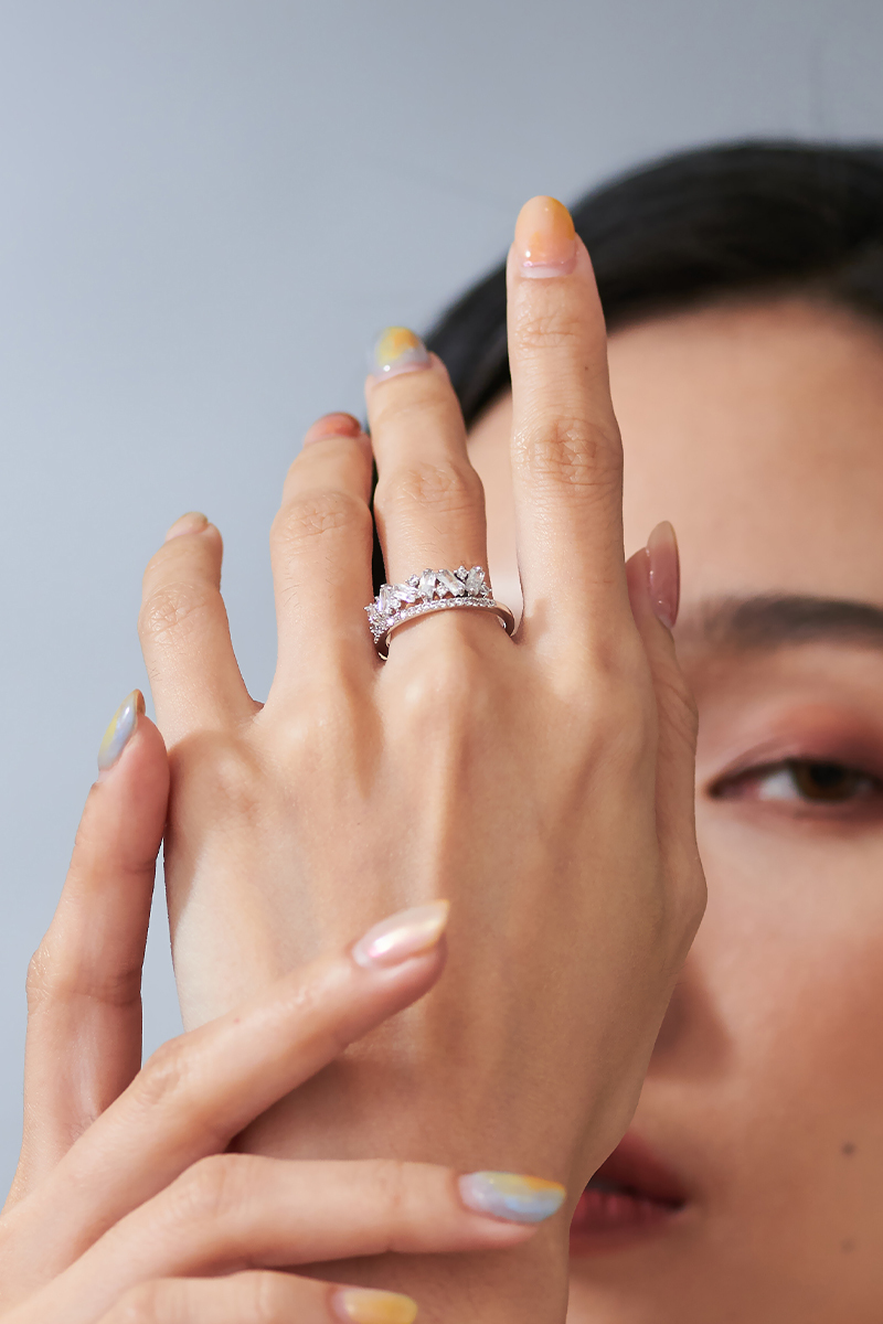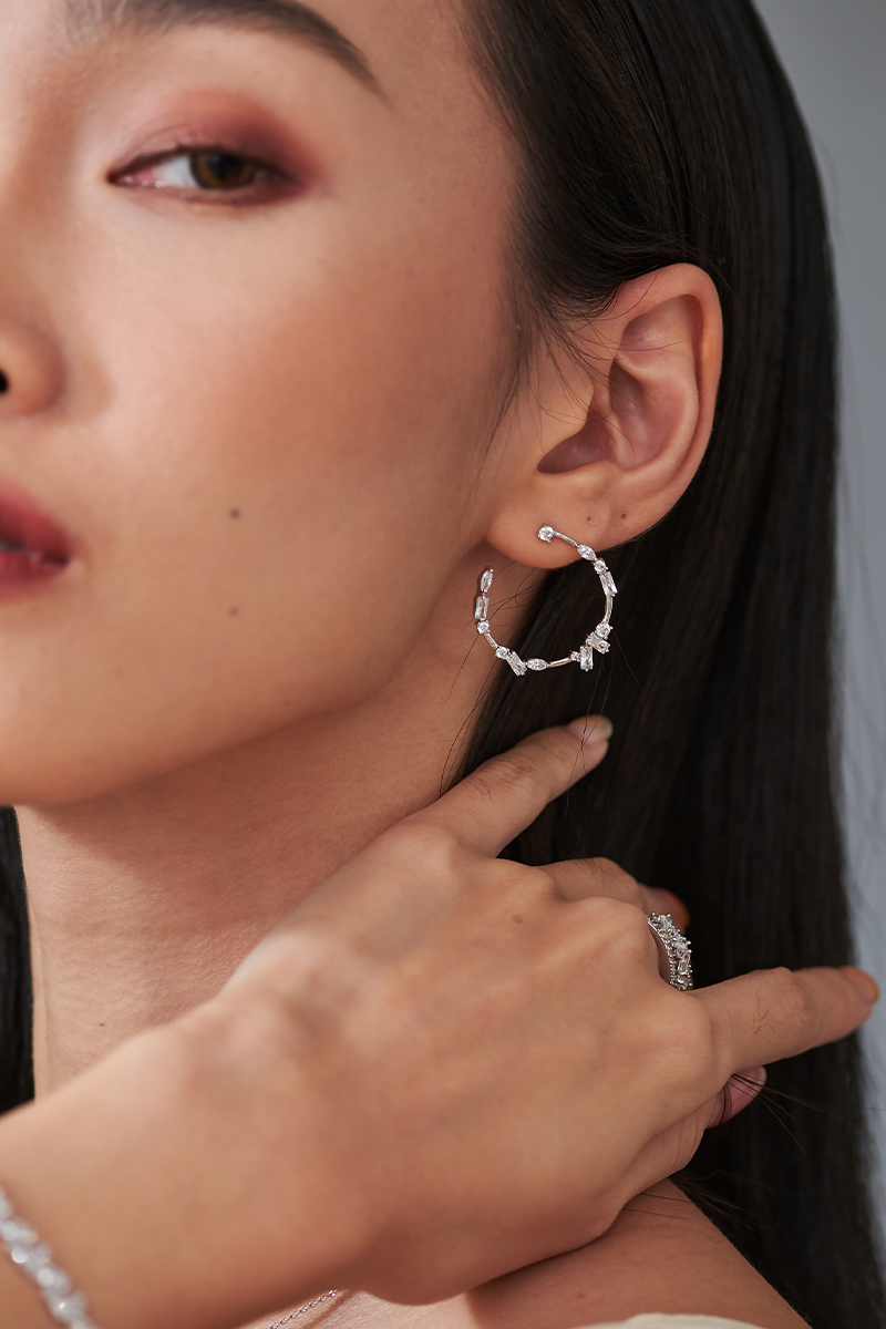 利用各種交錯或是用其他切割的鋯石穿插其中。 加上用多樣的排列。 在不同光影下,閃耀細緻的光芒。 看似簡單,但是工法繁複,巧思在小小的細節上。