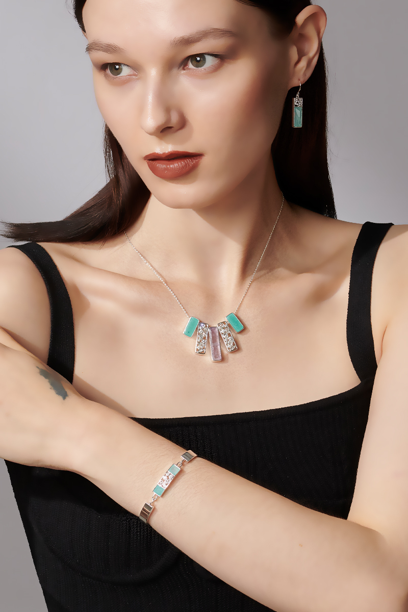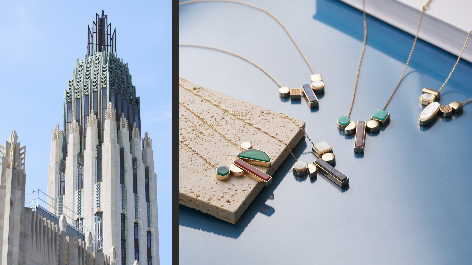 半圓形,長方形, 圓形, 正方形等如建築現代線條造型。設計出與眾不同的項鍊。 大膽用色及配色。 使此系列的飾品散發出如建築物都會又帶點工業風格的個性項鍊。 運用各種寶石,鋯石,金屬不同材質在一條項鍊上, 豐富的線條和材質勾勒出20世紀出多樣,精緻的大亨小傳黃金年代風貌。
