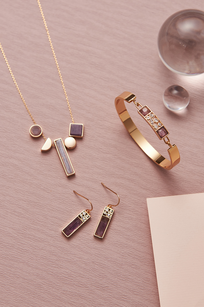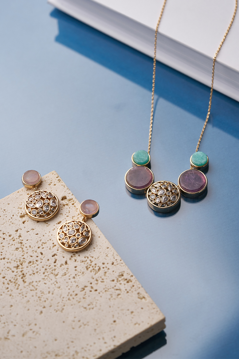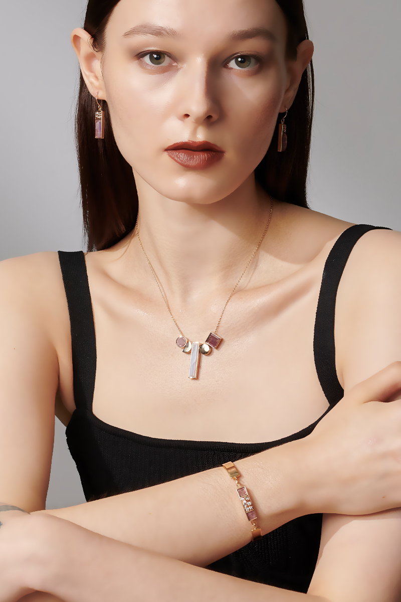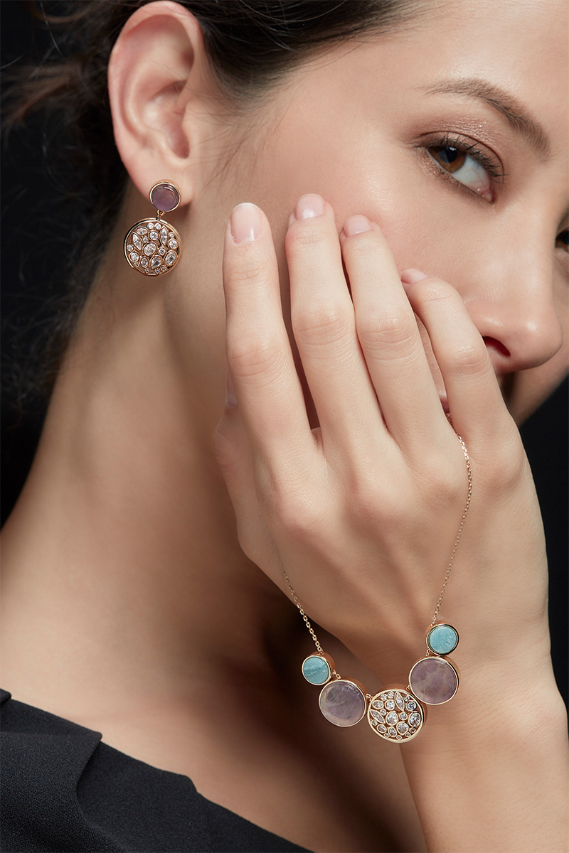 本系列運用了各種天然寶石鑲嵌在不同的幾何圖形。如建築般的交叉使用鋯石,天然寶石,精緻拋光的黃銅鍍金的金屬造型。